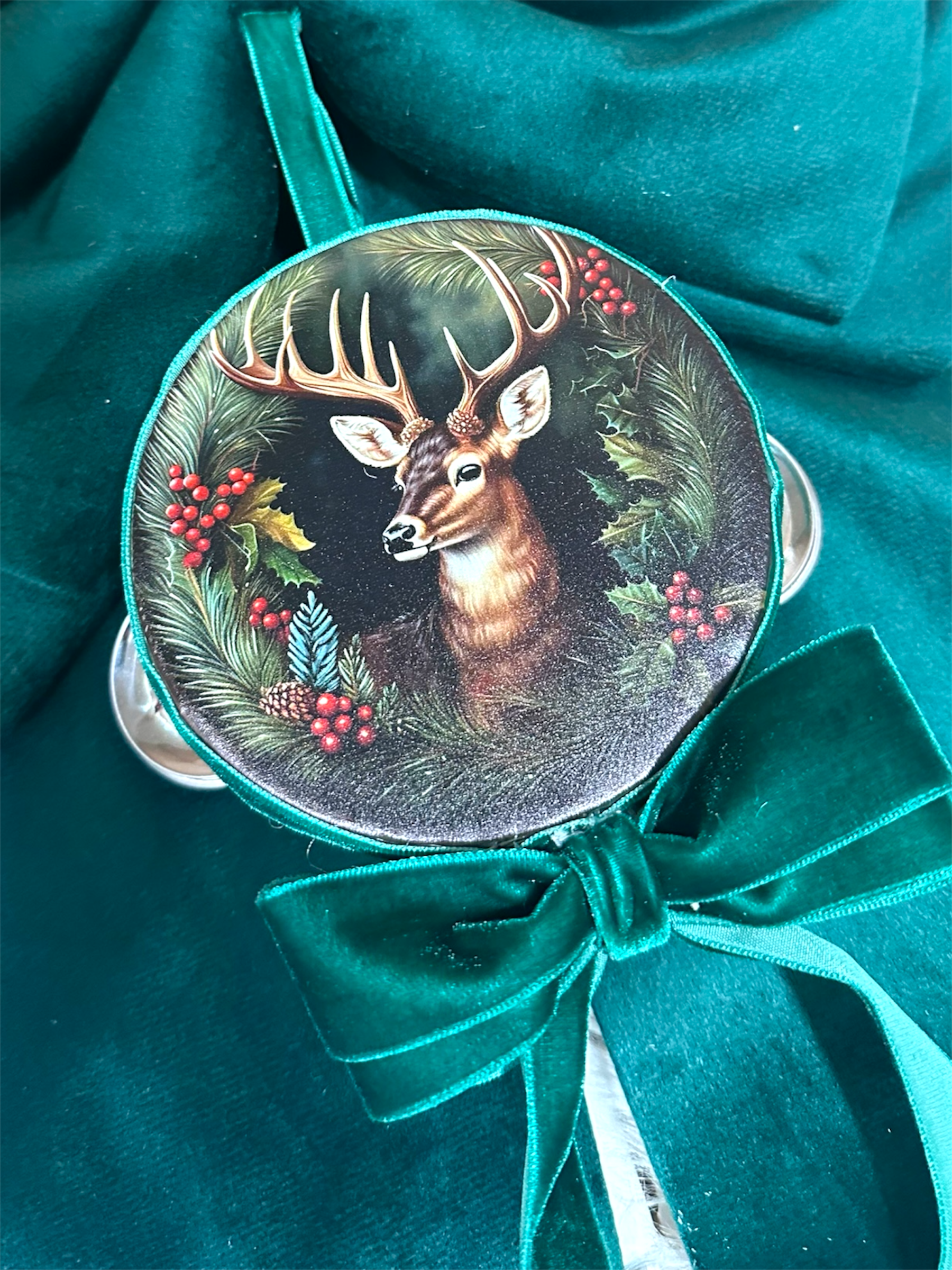 Un fiocco in velluto verde inglese, un tamburello che racconta la magia del Natale e il suo protagonista: il cervo, che sembra uscire dal bosco incantato, simbolo di forza e rinascita 🦌✨